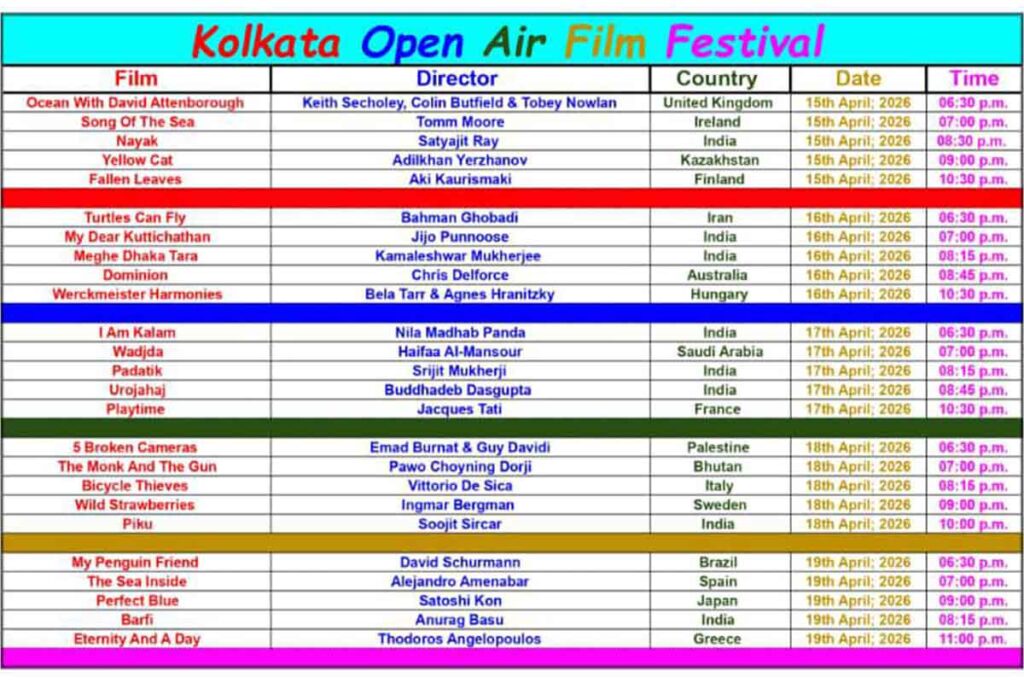 সিনেমার তালিকায়ও থাকে চমক, আর্ট ফিল্ম থেকে কমার্শিয়াল, ভারতীয় থেকে আন্তর্জাতিক, সব ঘরানার স্বাদই এখানে পাওয়া যায়। চলতি বছর ১৫ এপ্রিল থেকে ১৯ এপ্রিল পর্যন্ত চলবে এই উৎসব। নাকতলার এই চলচ্চিত্র উৎসবে দেশি-বিদেশি মিলিয়ে এক ঝাঁক কালজয়ী সিনেমার সমাহার থাকছে। যেমন: