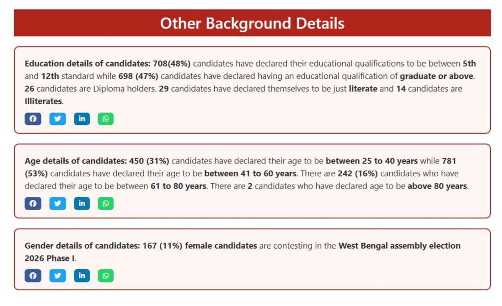নির্বাচন কমিশনে জমা দেওয়া হলফনামার বিশ্লেষণে ‘অ্যাসোসিয়েশন ফর ডেমোক্রেটিক রিফর্মস’ (এডিআর) এবং ‘ওয়েস্ট বেঙ্গল ইলেকশন ওয়াচ’-এর রিপোর্ট বলছে, প্রার্থীদের শিক্ষাগত মানচিত্র যেন একেবারে সমাজের প্রতিচ্ছবি— বহুরঙা, বৈচিত্র্যময়, কখনও বিস্ময়করও বটে।